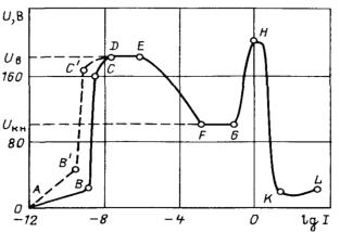 FG Ділянка нормального тліючого або, при високих тисках, іскрового та коронного розрядів. Незначне збільшення потенціалу, за рахунок збільшення площі вторинно-електронної емісії при постійній щільності вторинного струму, приводить до значного збільшення струму розряду.
