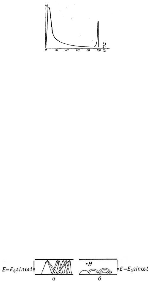 поверхнях електродів спостерігається явище лавиноподібного розмноження електронів (вторинно-електронний резонанс). Це явище відкрите Х.Э. Фарнсуортом в 1934 р. Для виникнення резонансу необхідно, щоб час між двома послідовними зіткненнями електронів з поверхнями електродів (рис.1.9а) дорівнював непарному числу напівперіодів високочастотного поля E (умови синхронізму). Розмноження електронів відбувається на поверхнях двох електродів, між якими прикладене високочастотне електричне поле, або на одній поверхні, поміщеної в схрещені електричне і магнітного поля (рис.1.9б).