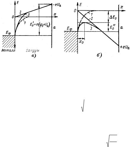 Якщо електроду a надати позитивний потенціал U a , крива зміни енергії приймає, вид, показаний на рис.1.4б. При цьому енергетичний бар'єр на поверхні катода зменшується на величину E0 . Обчислення цієї величини показує, що вона залежить від напруженості зовнішнього поля згідно