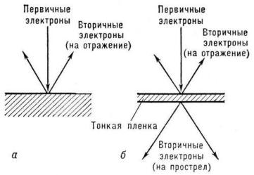 У тонких плівках вторинна електронна емісія спостерігається не тільки з поверхні, що піддається бомбардуванню (емісія на відбиття, рис. 1.5 а), але і із протилежної поверхні (емісія на простріл, рис. 1.5 б).