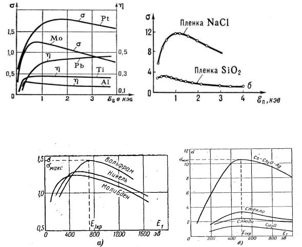 Рисунок 1.7 Залежність коефіцієнта вторинної емісії від енергії первинних електронів: а - для металів; б - для напівпровідників і діелектриків.