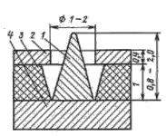 Рисунок 1.13 – Електронно-оптична комірка з мікракатодом (розміри в мікраметрах): 1 – молібденовий катод; 2 – керуючий електрод; 3 – діелектрична плівка з окислу кремнію; 4 – провідна підкладка.