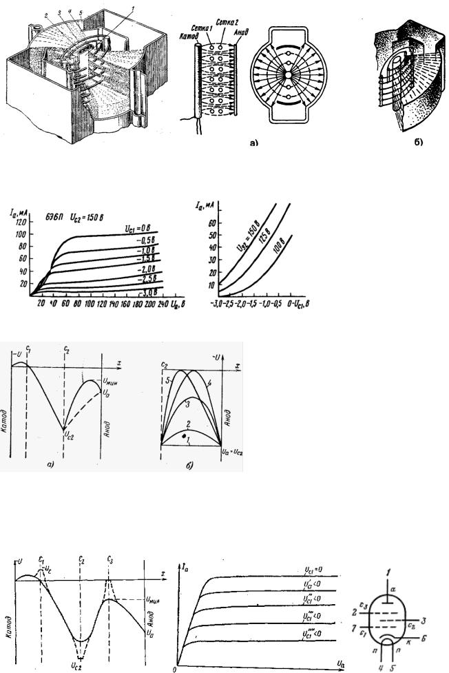 Рис. Розподіл потенціалу в пентоді та типові анодні характеристики пентода.