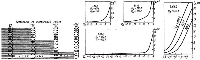 Рис. Проліт електронів скрізь сітки зі змінною густиною в пентодах – варимю (з подовженою характеристикою) при різних потенціалах на сітці, подовжені анодно-сіткові характеристики та типові анодно-сіткові характеристики пентодів типу Ж.