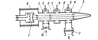 1- катод; 2, 3, 4 - вхідний, проміжний і вихідний резонатори; 5 - колектор; 6 - прольотні труби; 7 - вихідне вікно; 8 -