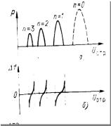 Вихідна потужність відбивних клістронів не перевищує декількох ватів. На рис. 6,а показана залежність