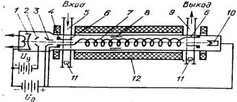 — вхідний хвилевід; 6 — перехід, що погоджує; 7—спіральна уповільнююча система; 8—локальний поглинач; 9—