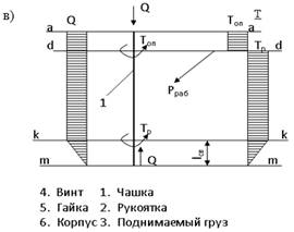 Через чашку 4 на головку винта 1 по плоскости контакта «а-а» передается вес Q груза 6. С другой стороны, винт 1 опирается своими витками на длине свинчивания на витки резьбы гайки (рис.1.б.). Так как каждому действию есть равное и противоположно направленное противодействие, в витках резьбы гайки 2 возникает опорная реакция Q', направленная вверх и действующая на винт (рис.1.в). Поэтому участок винта между чашкой 4 и гайкой 2 сжат. Эпюра сжимающих сил Q приведена на рис. 1.в.