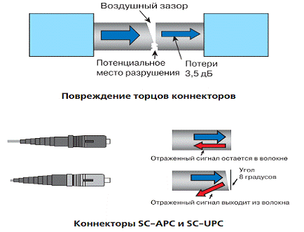 У конекторі APC торець скошений під кутом 8 °, тому відображена від кордону частина оптичного сигналу виходить з волокна (рисунок 1.7). При з'єднанні двох ідеально очищених конекторів UPC зворотнього відображення не відбувається зовсім, але якщо на кордоні мається бруд, то виникають серйозні проблеми через відбитий сигнал. Оскільки в польових умовах, як уже говорилося, уникнути забруднення конекторів набагато складніше (ніж у приміщенні вузла зв'язку), то в зовнішній мережі рекомендують застосовувати конектори APC, які не погіршують характеристики каналу через зворотнє відображення.