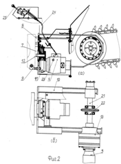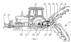 Машина для вскрытия трубопроводов (рис. 10) содержит базовое шасси 1, в качестве которого может быть применена стандартная тракторная база, левое и правое рабочее оборудование, а также устройство для контроля положения левого и правого рабочих органов.