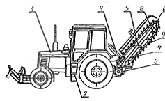 За кабиной трактора с задней его стороны установлен рабочий орган в виде транспортера, включающий приводной механизм 3, вокруг ведущей оси которого под действием пары гидроцилиндров 4 может поворачиваться вниз (в рабочее положение) и вверх (в транспортное положение) рама 5. Последняя снабжена ведущим 3 и ведомым 6 колесами и опорными роликами 7, на которые опирается цепная лента 8 с закрепленными на ней скребками 9.