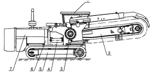 введения дополнительного поперечного транспортера 4, расположенного между кабиной 1 и силовым агрегатом 7. Транспортер выполнен в виде рамы с двумя барабанами, один приводится в движение гидромотором и приводит в движение транспортерную ленту.