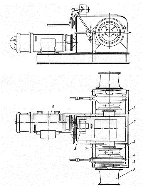 - фундаментарная рама; 2 - редуктор; 3 - звездочка; 4 - ленточный тормоз; 5 - стойка; 6 - швартовный барабан; 7 - грузовой вал; 8 - ручной рукояточный привод; 9 - фланцевый электродвигатель.