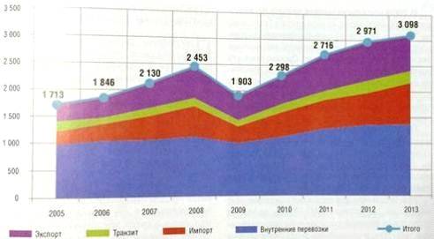 Второй по объему сегмент перевозок - это импорт. С 2005 по 2013 год железнодорожные перевозки в импорте выросли более чем в 3 раза - до 804 тыс. TEU. Около половины импортных грузов прибывают на морских судах и перегружаются на железную дорогу, еще 45% движутся через сухопутные погранпереходы. За последние 5 лет перевозки из морских портов выросли в 2,8 раза, через погранпереходы - в 2,3 раза.
