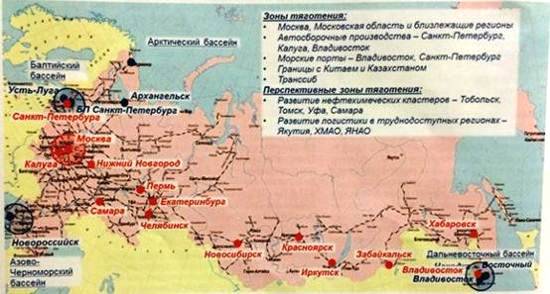 Еще одна зона развития - на погранпереходах с Китаем (Забайкальск) и вблизи от границы России с Казахстаном. Казахстан активно развивает транзитные контейнерные перевозки, в том числе на этот грузопоток ориентированы транспортно-логистические центры в Челябинске и Самаре.