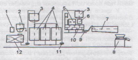 - водопідготовчий бачок, 2 - автомукомер, 3 - напірна місткість, 4 - ємності для бродіння закваски, 5 - дозувальна станція, 6 - дозатор закваски черпачковий, 7 - ємність для бродіння тіста, 8 - тістоділитель, 9 - шнековий насос, 10 - тістоміситель, 11 - шестерний насос, 12 - заварювальний машина