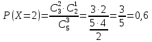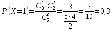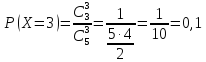 Х – число черных шаров среди вынутых может принимать значения: 1,2,3. Х=1, если вытащен 1 черный и 2 белых шара, Х=2, если вытащены 2 черных и 1 белый шар, Х=3, если вытащены три черных шара. Все исходы эксперимента – вытащить любые 3 шара из 5.