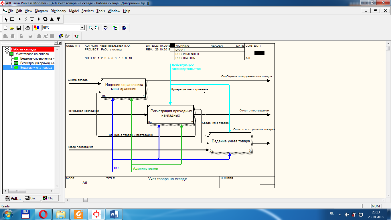 Опишите процесс работы склада с точки зрения его сотрудника. Разработать программный модуль «Склад», предназначенный для использования его сотрудниками. В базе содержатся сведения о товарах, категориях товаров, поставщиках, нумерации мест хранения. При поступлении товара осуществляется проверка свободных мест на складе, в базе фиксируется номер накладной, дата поставки, количество, и номер места на складе, куда будет помещен товар.