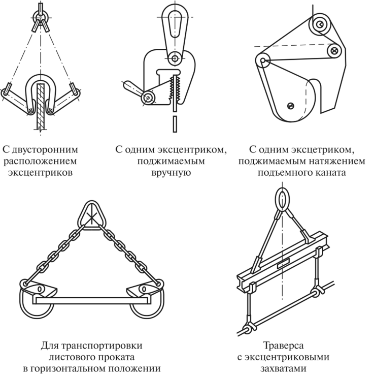 Эксцентриковые захваты бывают с односторонним или двухсторонним расположением эксцентриков, самозатягивающими или со специальными приспособлениями для дополнительного зажатия груза (рис. 6.24).