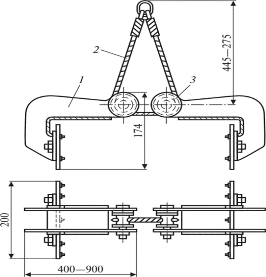 Рис. 6.22. Рычажно-канатный самозажимный захват: 1 — захват; 2 — цепь; 3 — крепления.