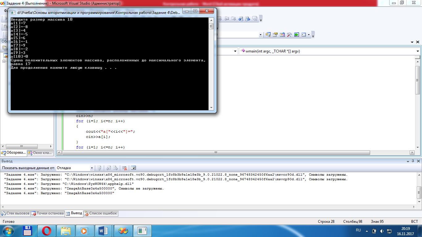 cout<<"Сумма положительных элементов массива, расположенных до максимального элемента, равна"<<s<<endl;