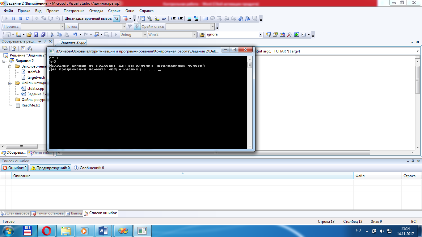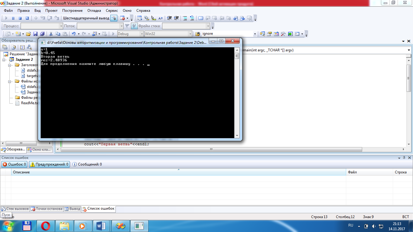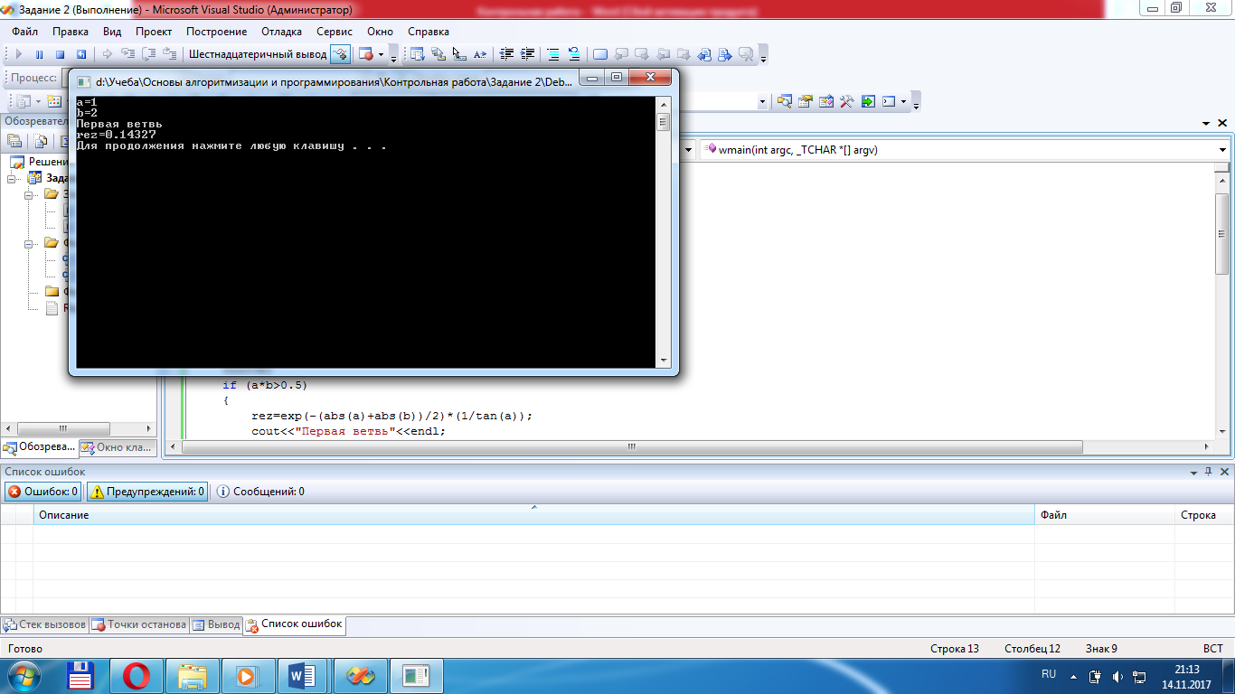 Для получения результатов подобрать исходные данные так, чтобы выполнялись все возможные ветви алгоритма. Перед выводом полученного результата должно выводиться сообщение о ветви, при прохождении которой он получен. Обратите внимание, что возможен случай, при котором исходные данные не будут подходить ни для одного из предложенных условий.
