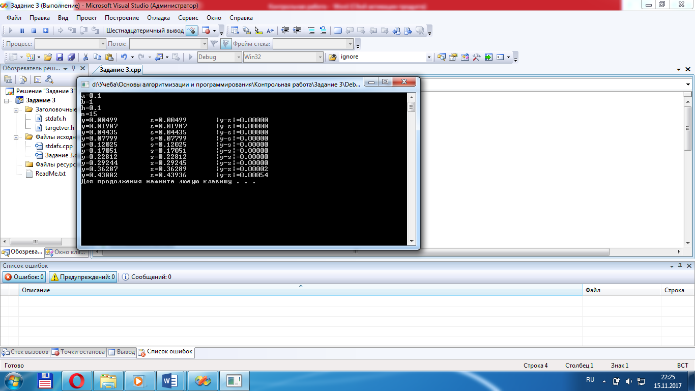 Задание 3. Для каждого x, изменяющегося от a до b с шагом h, найти значения функции Y(x), суммы S(x) и |Y(x)–S(x)| и вывести в виде таблицы. Значения a, b, h и n вводятся с клавиатуры. Так как значение S(x) является рядом разложения функции Y(x), при правильном решении значения S и Y для заданного аргумента x (для тестовых значений исходных данных) должны совпадать в целой части и в первых двух-четырех позициях после десятичной точки.