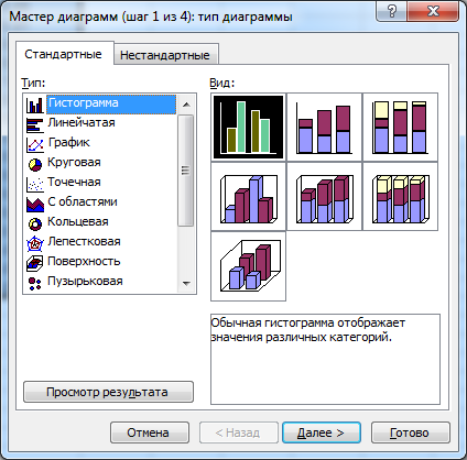 I. Выбирается тип диаграммы и настраивается её внешний вид.