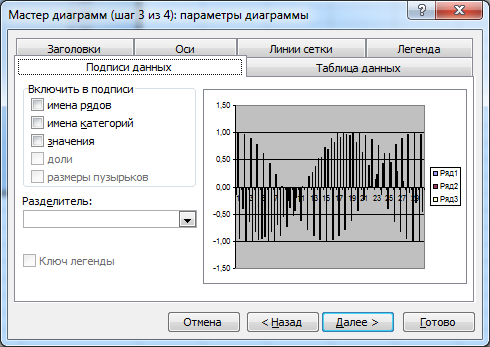 III. Параметры диаграммы: заголовки диаграммы и осей, выводить ли оси и линии сетки, наличие и местоположение легенды, вид подписываемых данных, наличие легенды.