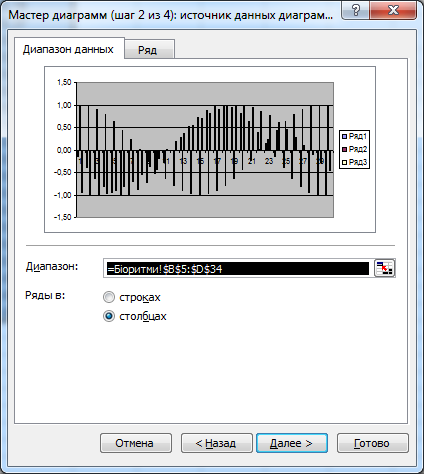 II. Диапазон данных для построения: направление (по рядам или столбцам), имена рядов, диапазон данных, подписи оси Х.
