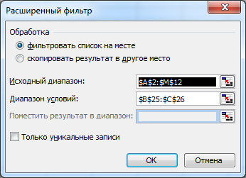 5. Указать диапазон условий (таблица, построенная в п. 1 целиком).