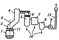 -конвертер; 2- кесон; 3- фурма, 4- камін; 5 - скруббер; 6 - вода; 7 - труба Вентурі; 8- циклон; 9 - нагнітач; 10 - шлам, 11 - рухома юбка, пристрій для опалювання