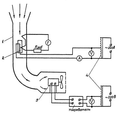 Скорость потока устанавливается путем изменения напряжения на моторе 3 вентилятора с помощью лабораторного автотрансформатора 4 и вольтметра (рис.6)
