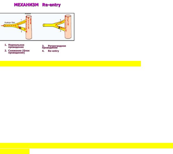 1.Повторный вход волны возбуждения в участках миокарда или проводящей системы сердца, отличающихся неодинаковой скоростью проведения импульса и развитием однонаправленной блокады проведения.
