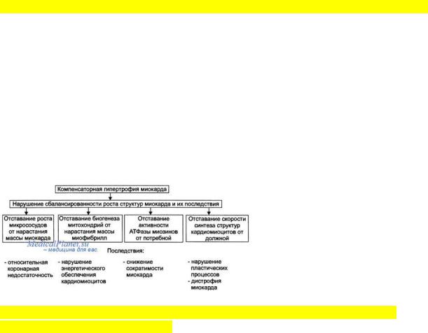 Гипертрофия миокарда – универсальный механизм компенсации перегрузки сердца. В основе: увеличение массы кардиомиоцитов и массы сердца, следовательно, восстановление после повреждения или увеличения после нагрузки сократительной способности сердца.