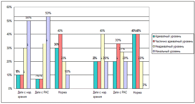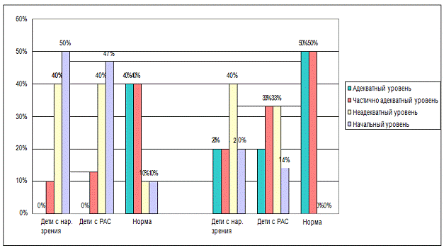 Частично-адекватного - 20% детей с нарушенным зрением, 33% детей с РАС и 50 % нормально развивающихся детей.