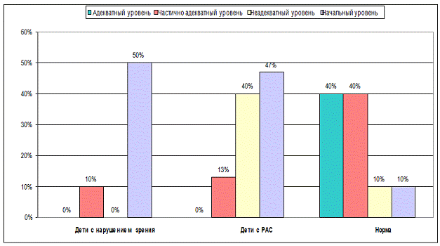Так, адекватного уровня достигли: 0% детей с нарушенным зрением, 0% детей с РАС и 40% нормально развивающихся детей.