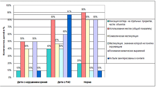 Среди детей с нарушениями зрения только 50% использовали жесты, из них символические жесты понятные другим людям использовали 40% детей, а 10% детей использовали жесты, не понятные окружающим.