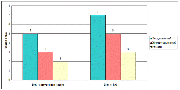 Полученные в ходе проведения этих двух методик результаты можно объяснить рядом закономерных факторов, самый весомый из которых - неумение детей с нарушениями зрения «считывать» мимически жестовые проявления эмоциональных состояний через сужение зрительного восприятия, а так же значительные трудности при вступлении в контакт детей с РАС.