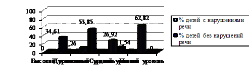 Сравнительный анализ результатов исследования состояния сформированности устной речи детей с заиканием и без нарушений речи свидетельствует, что дошкольников с заиканием с высоким уровнем сформированности устной речи не обнаружено, только 10,26% детей с заиканием показали достаточный, 26,92% - средний, а 62, 82% - низкий уровень уровень сформированности устной речи. Дети без речевых нарушений показали достаточно высокие показатели состояния сформированности устной речи, высокий уровень в 34,61% детей, достаточный - в 53,85%, а средний в - 11,54%. Низкого уровня сформированности устной речи среди этой категории детей обнаружено не было.