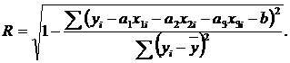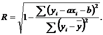 Такая величина называется корреляционным отношением. Она является приближенной оценкой тесноты связи, поскольку, как и коэффициент неопределённости, не учитывает числа степеней свободы у используемых сумм квадратов разностей. Первая из них (в числителе) имеет n - 2 степеней свободы, так как линейная зависимость накладывает две связи, отвечающие двум параметрам a и b. Вторая сумма имеет n - 1 степень свободы, поскольку накладывается одна связь, определяемая средним. В итоге данная оценка оказывается смещённой (несколько завышенной), чем обычно пренебрегают, особенно при большом объёме выборки. Отметим, что программные средства обычно выводят не R, а R2 и её несмещённую величину (Adjusted R2).