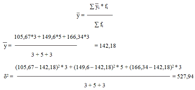 Для определения показателей вариации были выбраны три группы по результативному признаку и вычислены показатели вариации. Показателями вариации являются: групповая дисперсия, средняя из групповых, межгрупповая дисперсия и общая дисперсия.
