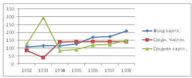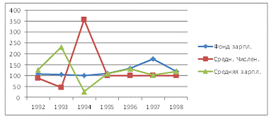 Графическое изображение базисных темпов роста свидетельствует о незначительном колебании средней заработанной платы период с 1992 по 1994гг. с одновременным колебанием средней численности рабочих в противоположном направлении, при этом фонд заработанной платы на всем протяжении временного периода практически остается неизменным.
