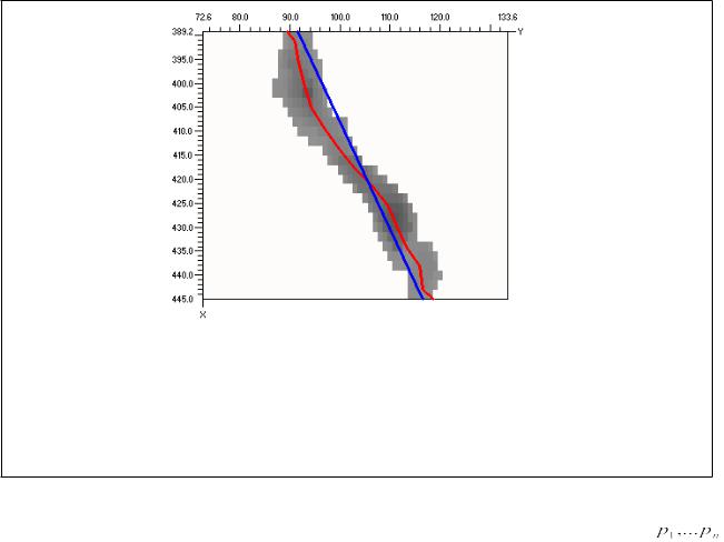 Рассмотренные выше процедуры дают достаточно грубое приближение линии нарушения. Особенно это относится к алгоритму, основанному на преобразовании Радона: результат его работы – отрезки прямых линий. Для уточнения и сглаживания линий нарушения используется описанная в данном разделе процедура: строится рациональный В-сплайн ([12]), наилучшим образом описывающий зону повышенной неоднородности волнового поля (рис. 6).