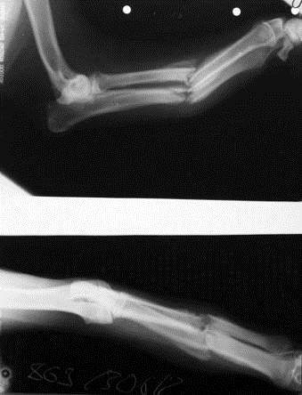 На момент поступления больного животного в клинику на основании анамнеза и клинических признаков при первичном осмотре был поставлен предварительный диагноз: перелом костей предплечья левой грудной конечности.