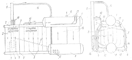 Верхний барабан 1 в области топочной камеры заменен двумя коллекторами 2 экранов 3. Во II ступень испарении выделены передние части обоих боковых экранов путем установки в верхних 2 и нижних коллекторах 4 перегородок 5. Питание экранов II ступени испарения осуществляется из двух выносных циклонов 6 через опускные трубы 7, соединенные с нижними коллекторами 4 экранов 3. Подпитка циклонов ведется из нижнего барабана 8 по трубам 9. Пароводяная смесь из труб экранов поступает в переднюю часть верхних коллекторов 2, откуда по трубам 10 направляется в выносные циклоны 6. После отделения воды пар отводится по трубам 11 в барабан 1, а вода идет в опускные грубы циклонов. Питание экранов 1 ступени испарения происходит через трубы 12, приваренные к нижнему барабану и нижним коллекторам экранов. Пароводяная смесь из экранов этой ступени испарения отводится по трубам 13 в верхний барабан. Из-за небольшой высоты контуров у всех экранов обеих ступеней испарения имеются рециркуляционные трубы 14.