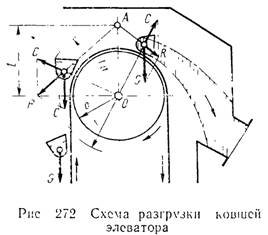 В зависимости от скорости движения тягового органа, частоты вращения и диаметра барабана (звездочки), соотношения полюсного расстояния (расстояние от центра вращения до полюса) и радиуса барабана (звездочки) определяется способ разгрузки ковшей.