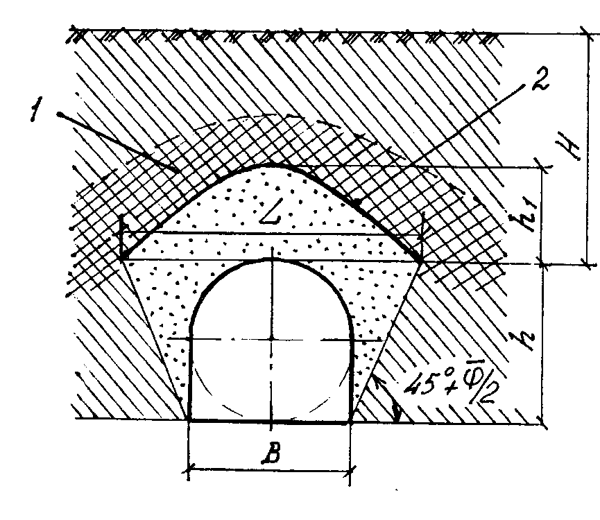 Высота свода обрушения hв при расположении тоннеля в нескальных необводненных грунтах при глубине заложения тоннеля Н 1 <45м определяется по формуле: