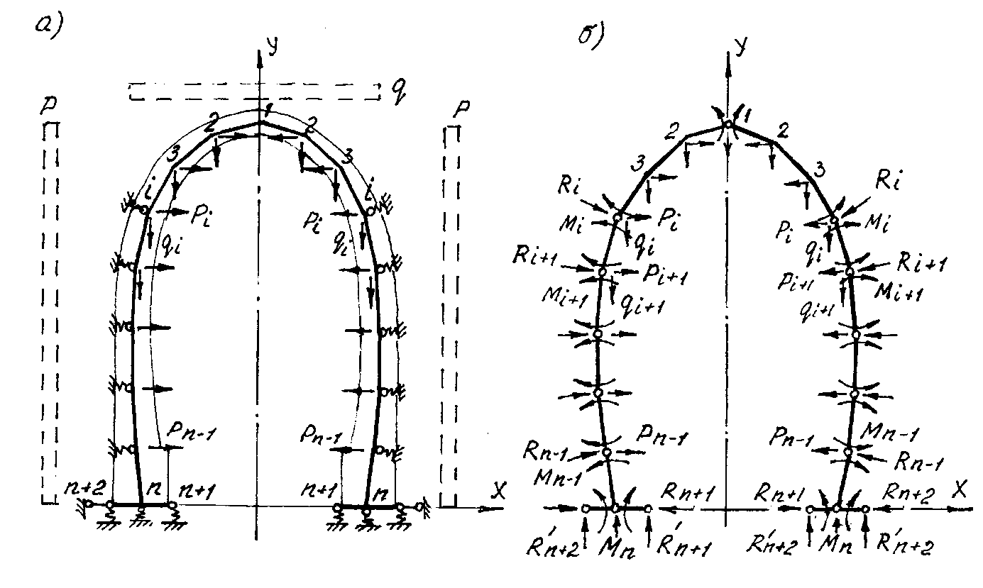 Рис.5.2. Расчетная схема обделки как стержневой конструкции в упругой среде (а) и