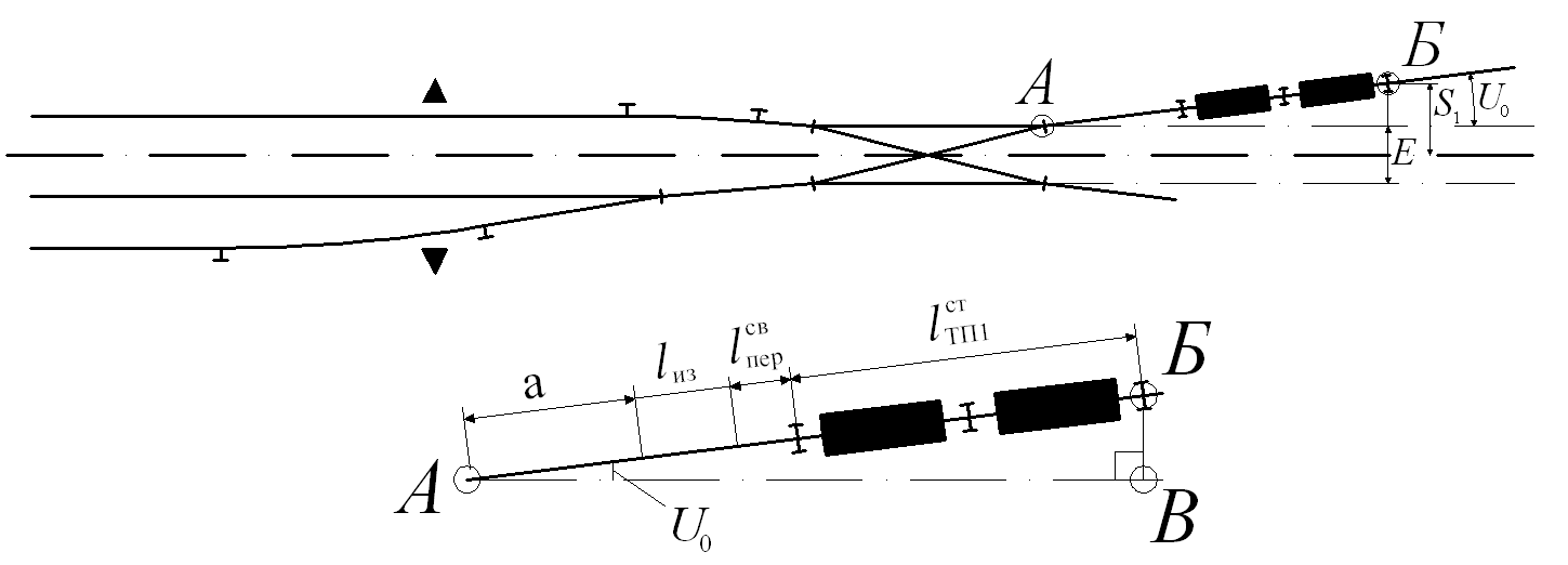 Схема для определения расстояния от начала прямого участка для размещения второй тормозной позиции до стыка стрелочного перевода за ней (S2) представлена на рисунке 2.2.